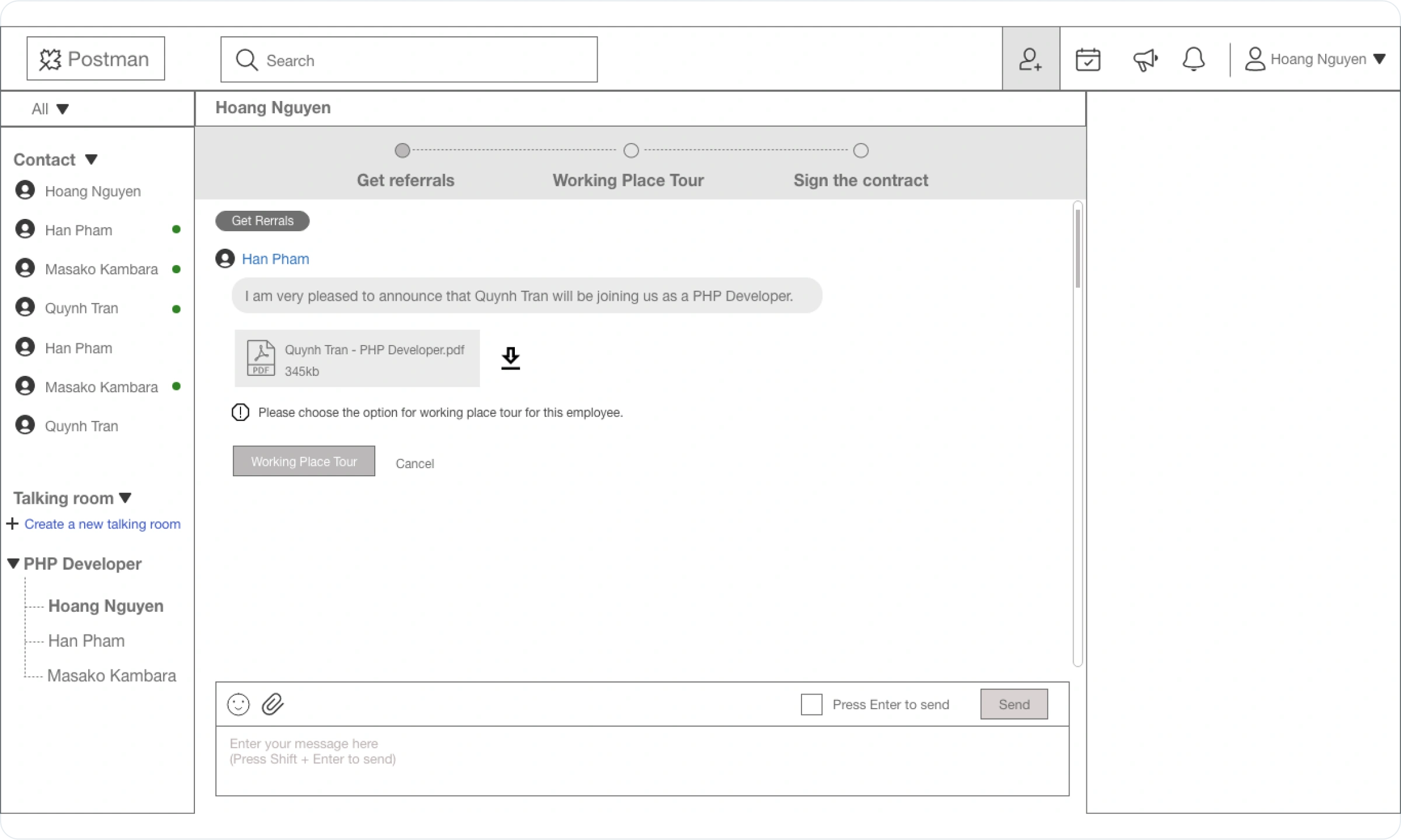 connects the candidate with HR, enabling the contract
